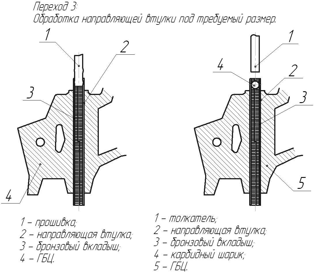Третій перехід: "Обробка н.в.к. під необхідний розмір" Встановлена бронзова втулка, шляхом прошивки, набором гладких прошивок(що збільшуються по діаметру з кроком 0.02мм, від меншого розміру до більшого), ущільнюється по товщині стінки втулки і розрівнюється по усій поверхні внутрішнього діаметру н.в.к. Цим переходом ми виконуємо два дуже важливих технологічних вимоги.