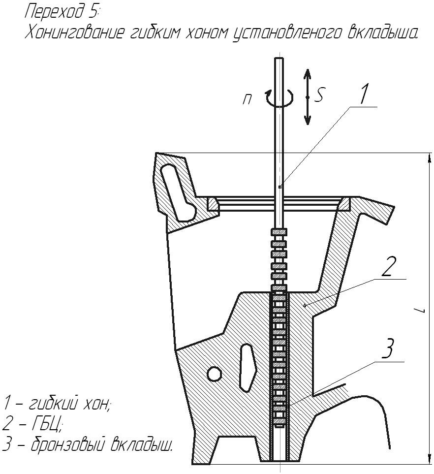П'ятий перехід: "Фінішна обробка внутрішнього діаметру". Внутрішній діаметр встановленого бронзового вкладиша обробляється спеціальним інструментом - хон гнучкий.