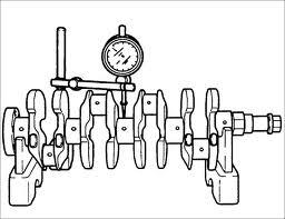 Етап 1: перевірка колінчастого валу на вигин осі корінних шийок : Колінчастий вал укладається на призми. За допомогою стрілочного індикатора, встановленого на стойці, перевіряємо вигин осі колінчастого валу, як правило спершу по центральній шийці, обертаючи колінчастий вал. Вигин не повинен перевищувати: