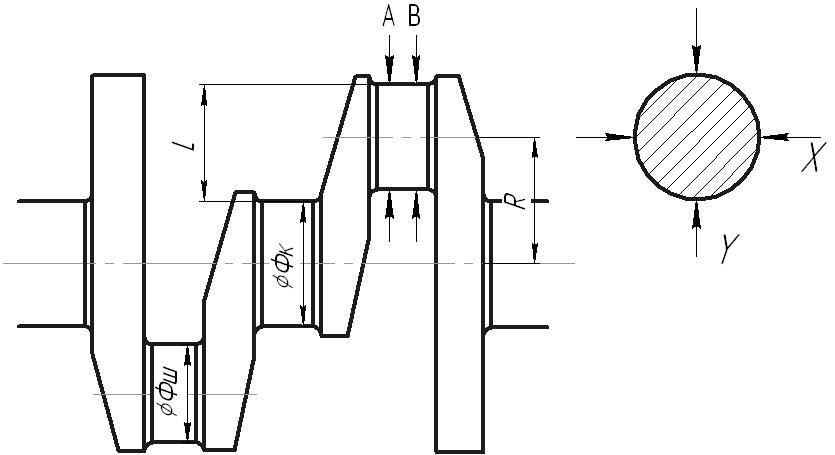 Вимір корінних і шатунових шийок А, В - місця виміру діаметру по осях Х і Y. (Вимір корінних шийок умовно не показаний)