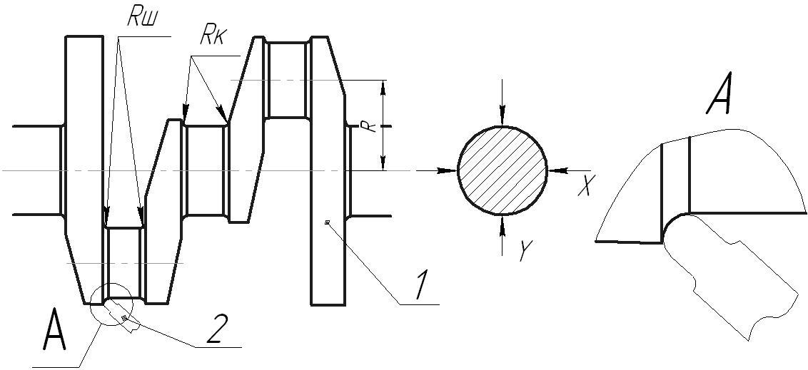 Етап 2: мікрометром вимірюють, по черзі, діаметри корінних і шатунових шийок, як показано на малюнку нижче, а радіуси галтелів корінних(Rк) і шатунових(Rш) шийок вимірюють шаблоном-радиусомером, а також вимірювальним інструментом(рейсмас або ШЦ- 150) визначається радіус кривошипа(R), дивися наступний малюнок. Радіус кривошипа можна розрахувати по формулі: R={(Фш-Фк): 2} L; де: