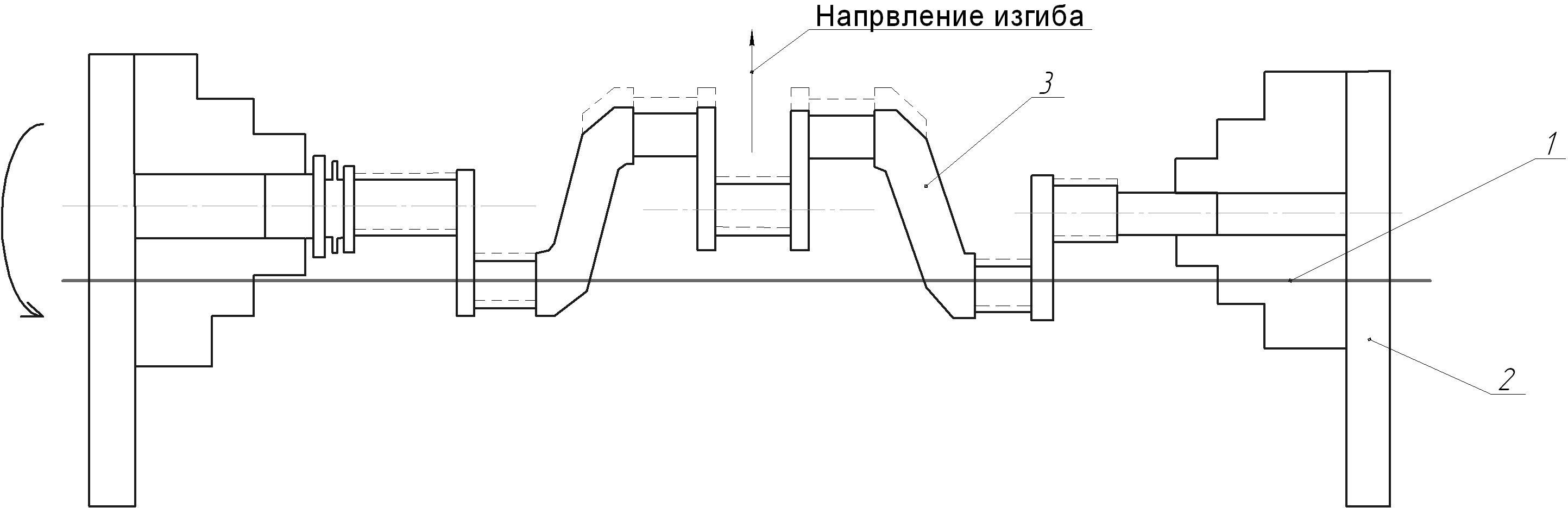Вигин колінчастого валу при шліфовці шатунових шийок. 1 - вісь центрів верстата; 2 - вузол зміщення центрів на вісь шатунових шийок; 3 - колінчастий вал.