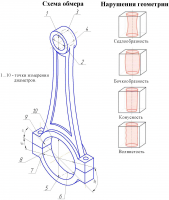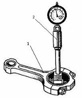 When a defective connection rod is submitted to repair, measuring shall be performed. Rod axis bending, centre-to-centre distance between the top and bottom end, as well as inside diameter of the rod top and bottom end shall be measured. Measuring is performed as shown in the figure